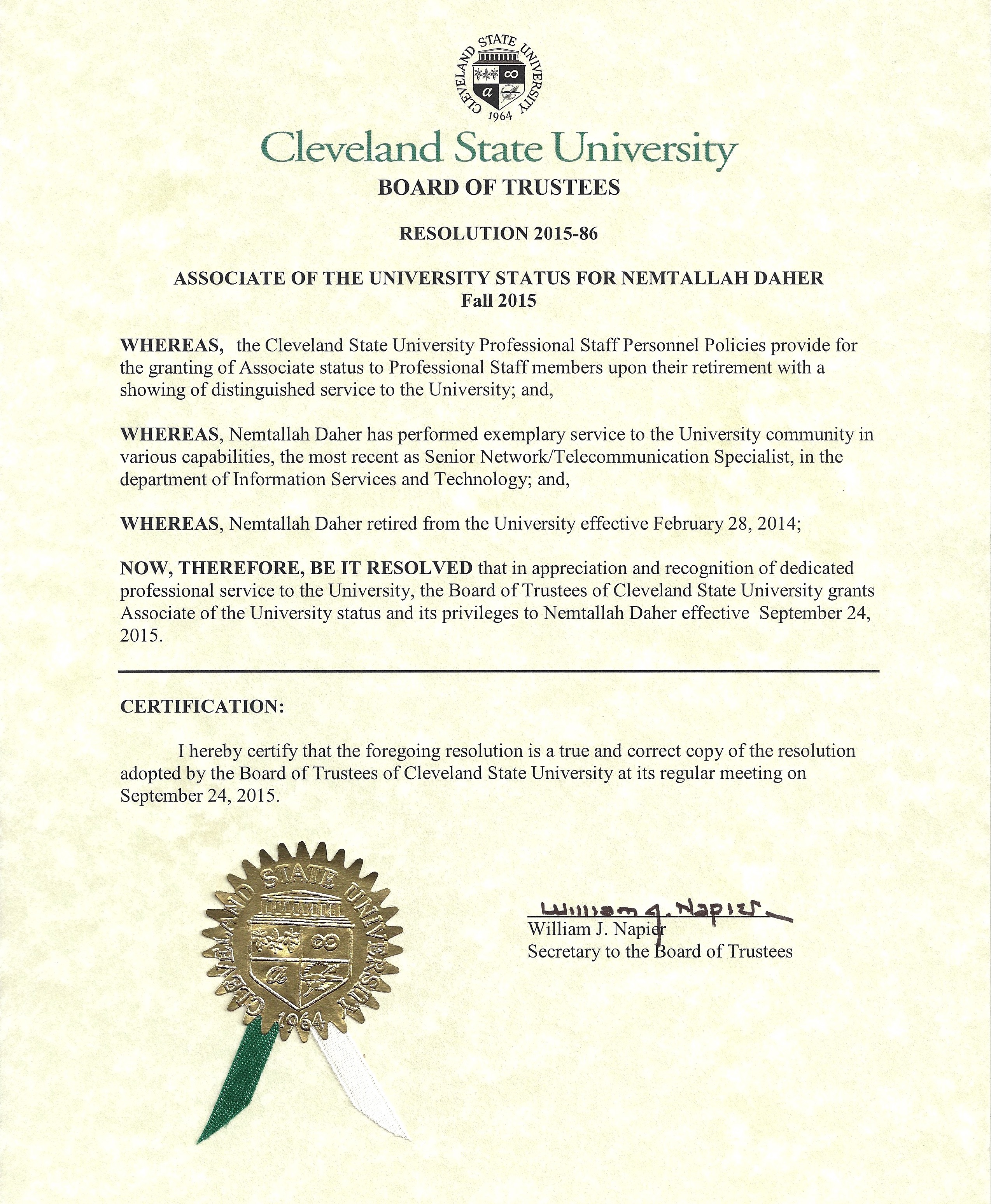 I received a large envelope from Cleveland State University in today’s mail. Inside the envelope, much to my surprise and pleasure, was a letter and certificate announcing that I have been awarded the status of Associate of the University by the Board of Trustees of Cleveland State University. I am not really sure what that means, …